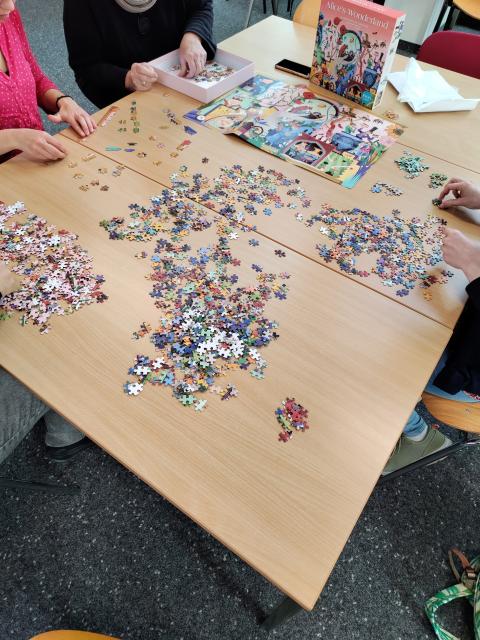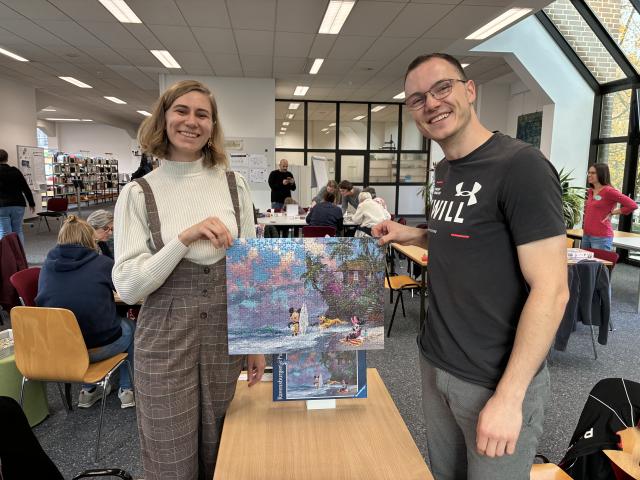 Die Runde war bunt durchmischt, Jung und Alt fanden sich zusammen. Zeitweise puzzelten 30 Puzzlebegeisterte gleichzeitig in der Lernwerkstatt der Stadtbibliothek Aachen, sodass noch weitere Tische benötigt wurden.